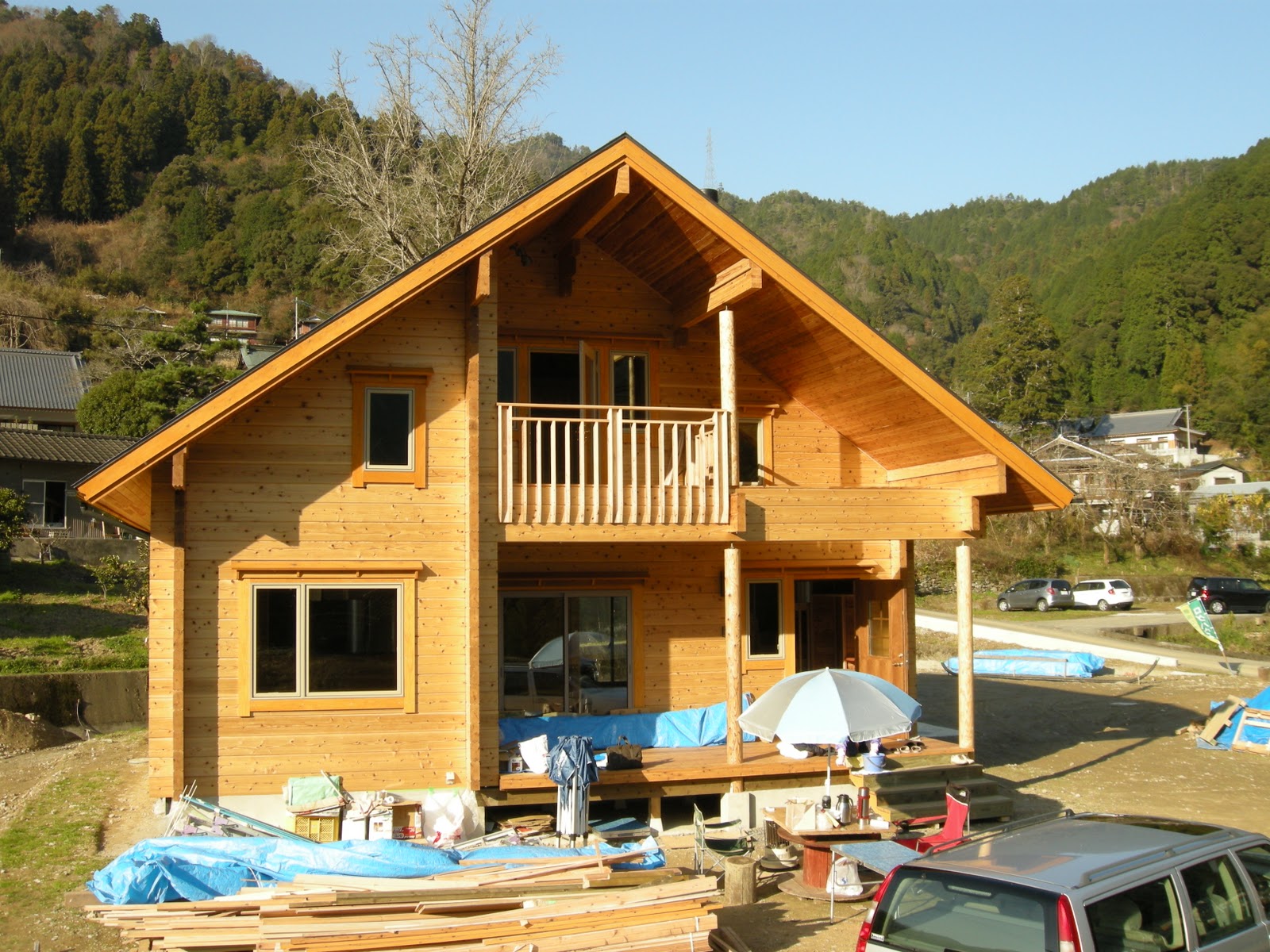 徳島の国産材ログハウス2010年12月22日 先週末は徳島県三好市で国産杉のログハウスの見学会でした。里山の風景にも映える堂々とした大型住宅、内装も国産材にこだわった合板ゼロのログハウスです。 周辺にログハウスがあまり建っていない地域だったので、「何が建ったのかな?」と近隣の方も見学にいらっしゃっいました。スタッフがみなさんのお話を聞いたところでは、やはり「ログハウスは山荘」というイメージが強いようです。もちろん山荘にもぴったりですが、「住宅ログハウス」をもっともっとアピールしないといけないですね。