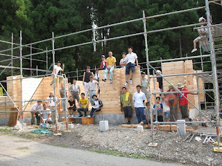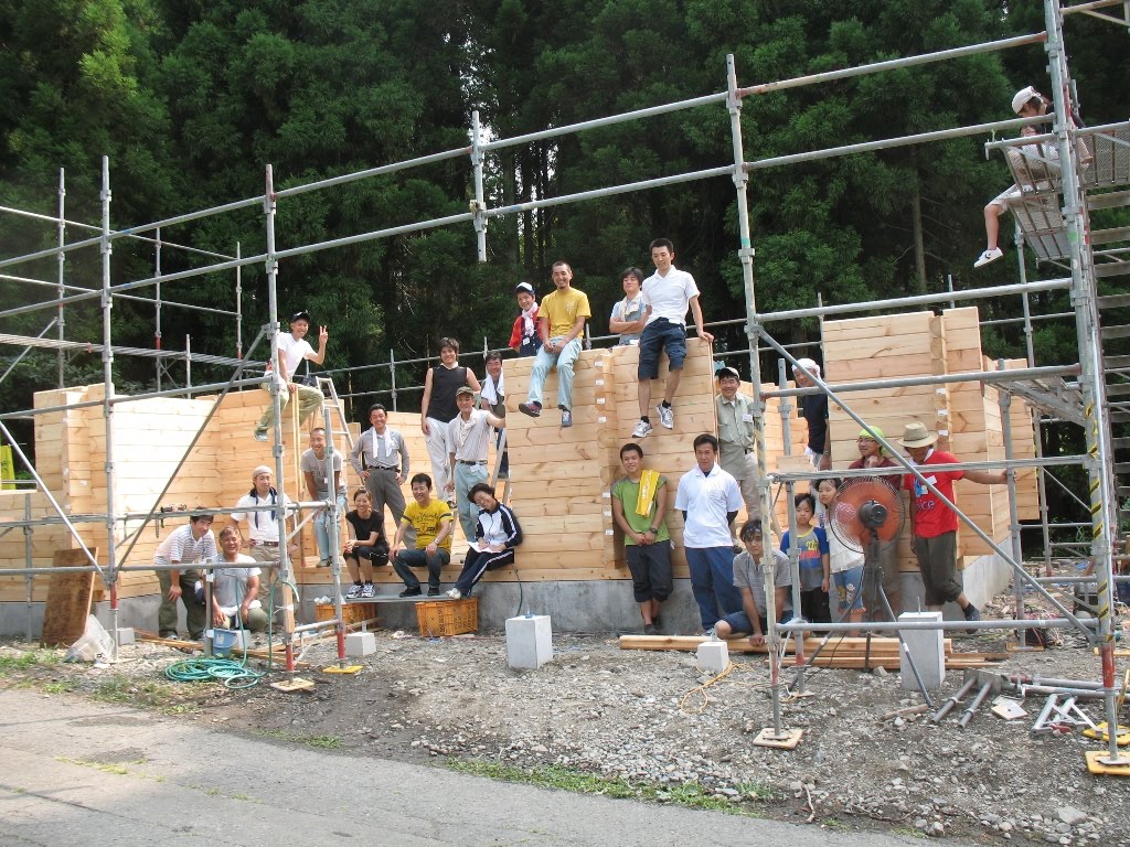 滋賀のセルフビルドスクール2010年8月3日 先週末は滋賀県高島市でセルフビルドスクールを開催しました。あまりの暑さに早めに切り上げたとのことですが、それでもこの段数!通常通りなら桁までいきましたね。上の写真は現場向かいの川で行った「鮎のつかみ取り大会」!鮎は買ってきて放したそうですが(笑)。こんな楽しいTALOのスクールに是非一度ご参加ください。