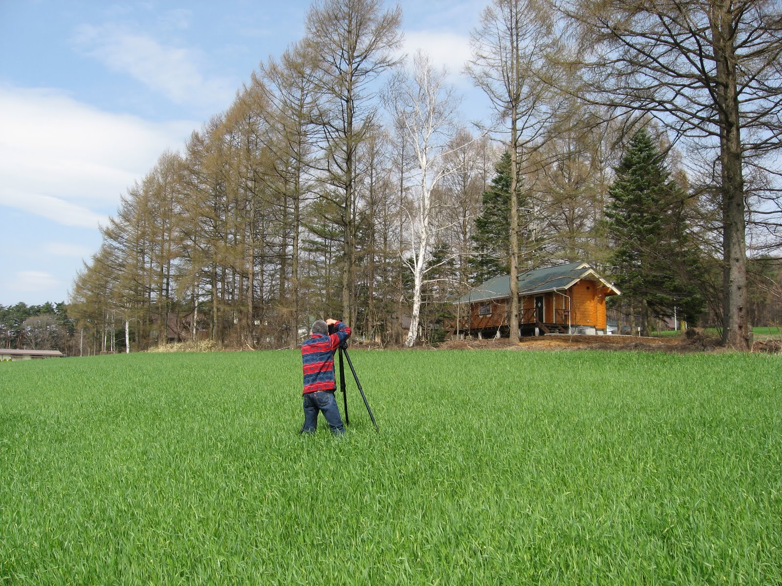 清里の春2010年4月21日 月曜日は撮影で清里に。写真はカメラマンさんの撮影風景。青々とした草地は肥料用のもので、4月末ぐらいまでにはトラクターで耕して家畜用のトウモロコシを植えるそうです。近くには牛舎もあって清里らしい素晴らしいロケーションでした。天気にも恵まれていい写真が撮れたと思います。小さく写ってますが、建物はコンパクトな平屋モデル。別荘の場合は特に無駄に大きなログハウスはいらないというリクエストがとても増えていますね。