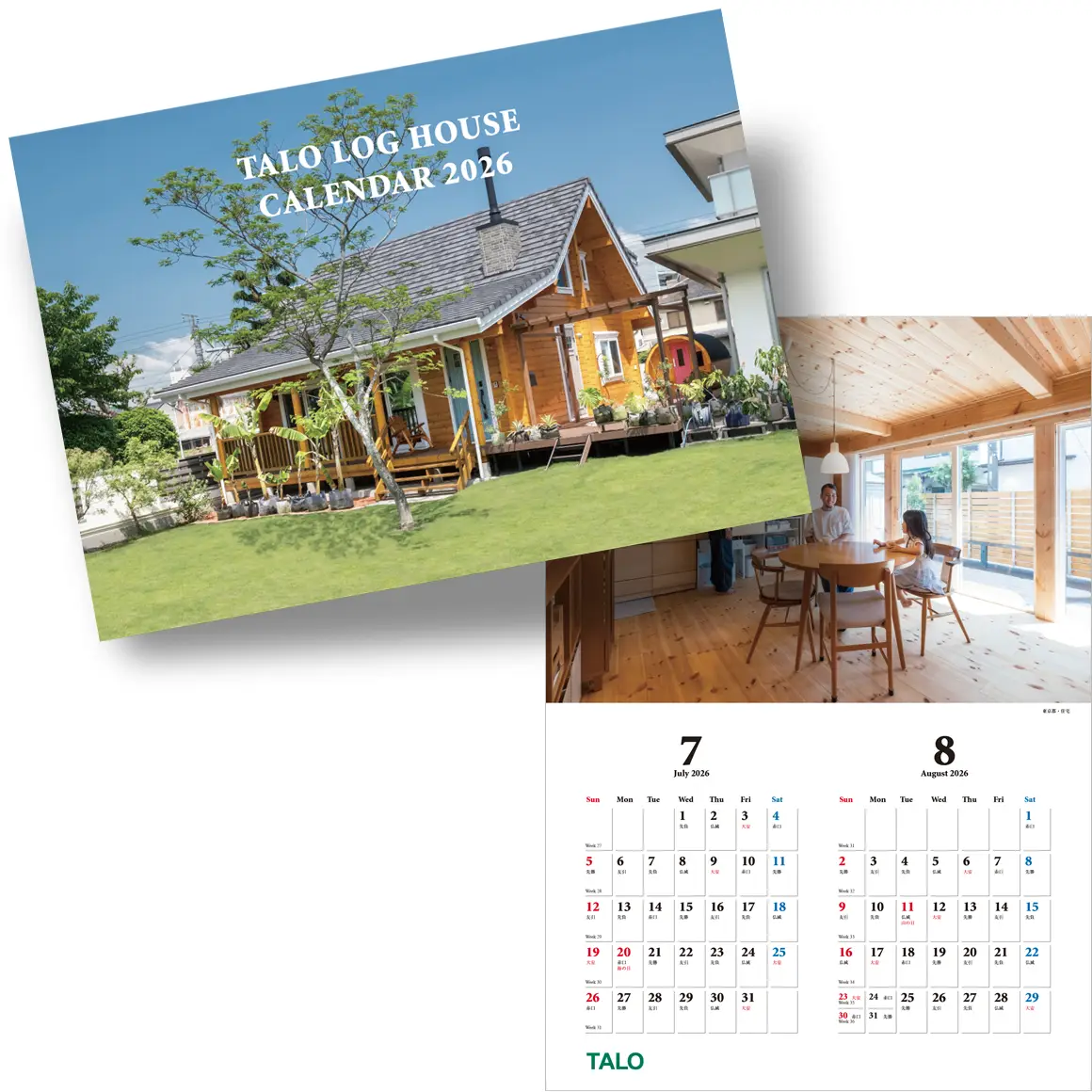 TALOログハウスの実例写真が多数掲載された2026年オリジナルカレンダーが完成しました!カタログをご請求頂いた方にもれなくプレゼントいたします。